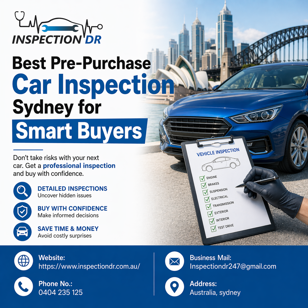 In Sydney’s competitive used car market, smart buyers never skip a pre-purchase inspection. Professional services thoroughly evaluate the car’s condition, uncover hidden issues, and verify its reliability. This step helps you avoid scams and overpriced vehicles. With a detailed inspection report, you gain bargaining power and clarity before making a purchase. Investing in an inspection today can save you from major expenses tomorrow. Contact us: https://www.inspectiondr.com.au/Smart Buyers Choose Pre-Purchase Car Inspection Sydney First In Sydney’s competitive used car market, smart buyers never skip a pre-purchase inspection. Professional services thoroughly evaluate the car’s condition, uncover hidden issues, and verify its reliability. This step helps you avoid scams and overpriced vehicles. With a detailed inspection report, you gain bargaining power and clarity before making a purchase. Investing in an inspection today can save you from major expenses tomorrow. Contact us: https://www.inspectiondr.com.au/0 Comments 0 Shares 249 Views 0 Reviews -